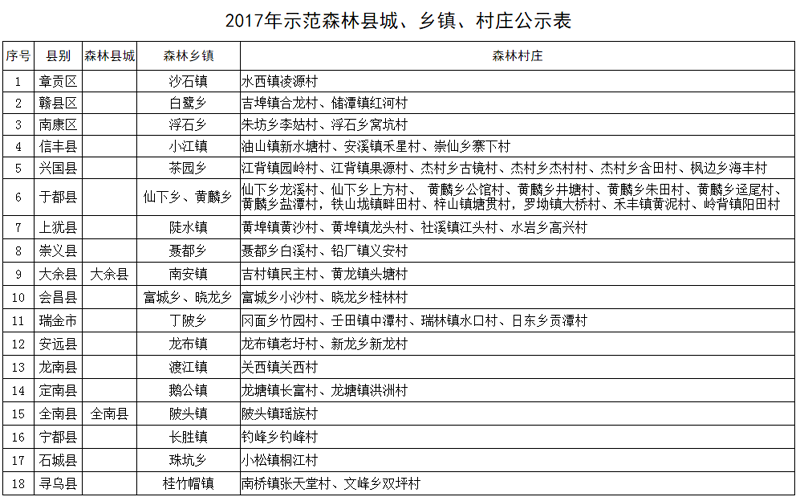 根据赣州市林业局《关于开展2017年油茶产业精准扶贫示范基地和森林城乡建设考评验收的通知》(赣市林计[2017]40号)文件精神,结合全市扶贫攻坚和对口支援工作的需要,市林业局、市财政局组织人员对2017年度森林县城、乡镇、村庄进行了检查验收。现将2017年示范森林县城、乡镇、村庄名单予以公示,以接受社会各界监督。若有异议,请在2017年12月26日前向赣州市林业局反映。联系电话:8196483。